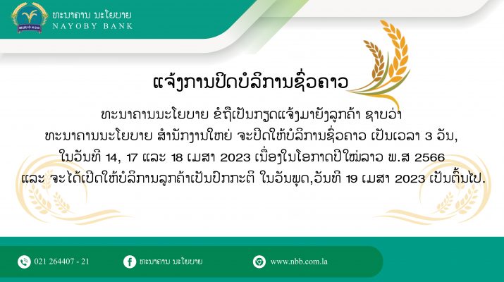 ທາງທະນາຄານນະໂຍບາຍຈະໄດ້ປິດໃຫ້ບໍລິການຊົ່ວຄາວໃນວັນທີ 08/03/2023 ເນື່ອງໃນໂອກາດສະເຫຼີມສະຫຼອງວັນແມ່ຍິງສາກົນຄົບຮອບ 113ປີ ແລະ ຈະເປີດໃຫ້ບໍລິການເປັນປົກກະຕິໃນວັນທີ 09/03/2023 ເປັນຕົ້ນໄປ