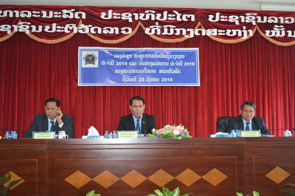 ວັນສຸກ ທີ 25 ມັງກອນ 2019 ທະນາຄານ ນະໂຍບາຍ ສາຂາຫົວພັນ ໄດ້ເປີດກອງປະຊຸມ ສະຫຼຸບການເຄື່ອນໄຫວວຽກງານຮອບດ້ານປະຈຳປີ2018 ແລະ ວາງແຜນການເຄື່ອນໄຫວວຽກງານຮອບດ້ານປະຈຳປີ2019 ຂື້ນ ທີ່ຫ້ອງປະຊຸມໃຫ່ຍ ຊັ້ນ III ຫ້ອງການທະນາຄານ ນະໂຍບາຍ ສາຂາຫົວພັນ ໂດຍພາຍໃຕ້ການເປັນປະທານຂອງທ່ານ ທີບພະກອນ ສູນດາລາ ວ່າການຫົວໜ້າສາຂາ, ເຂົ້າຮ່ວມກອງປະຊຸມ ມີທ່ານ ຄຳພັດ ແກ້ວວິໄລ ຮອງເລຂາໜ່ວຍພັກ ຮອງຫົວໜ້າສາຂາ, ທ່ານ ສົມພານ ຍວນມາ ຮອງຫົວໜ້າສາຂາ, ມີບັນດາຫົວໜ້າ, ຮອງຫົວໜ້າແຕ່ລະຂະແໜງການ, ຫົວໜ້າ, ຮອງຫົວໜ້າແຕ່ລະໜ່ວຍບໍລິການ ແລະ ພະນັກງານວິຊາການ ພາຍໃນຫ້ອງການສາຂາ – ໜ່ວຍ ເຂົ້າຮ່ວມ 52 ທ່ານ, ຍິງ 19 ທ່ານ.