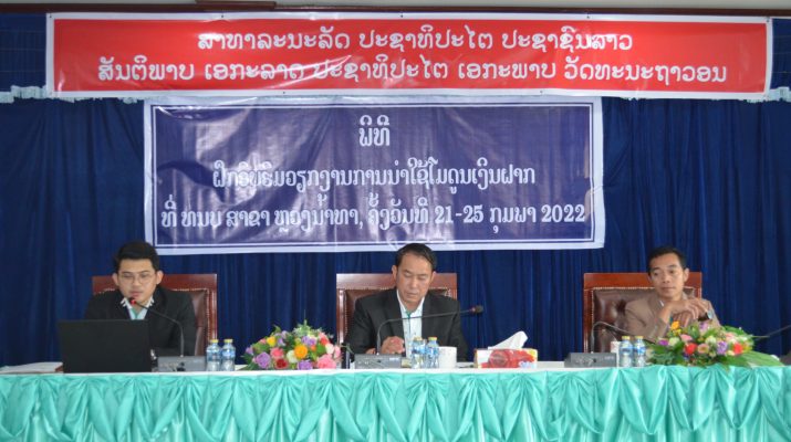 ພິທີດັ່ງກ່າວ ທ່ານ ວົງວິໄລ ຊະນະແຕ້ມ ຮອງພະແນກເຕັກໂນໂລຊີຂໍ້ມູນຂ່າວສານ ໄດ້ຜ່ານບົດສະຫຼຸບໂດຍຫຍໍ້ ກ່ຽວກັບຜົນສຳເລັດການເຄື່ອນໄຫວພັດທະນາໂມດູນເງິນຝາກ. ຫຼັງຈາກນັ້ນ, ທ່ານ ສີຟອງ ແກ້ວກົງຕາ ຫົວໜ້າສາຂາ ໄດ້ກ່າວເປີດພິທີຝຶກອົບຮົມຢ່າງເປັນທາງການ ແລະ ທ່ານໄດ້ເນັ້ນໜັກໃຫ້ພະນັກງານທຸກຄົນຈົ່ງຕັ້ງໃຈສຶກສາບົດຮຽນໃນການຝຶກອົບຮົມຄັ້ງນີ້, ຖ້າມີບັນຫາໃດຍັງບໍ່ທັນຮູ້ບໍ່ທັນເຂົ້າໃຈ ໃຫ້ຕັ້ງເປັນຄໍາຖາມເຈາະຈີ້ມຂື້ນມາ. ຈາກນັ້ນ, ຄະນະວິທະຍາກອນ ສະເໜີຫົວຂໍ້ການຝືກອົບຮົມມີຄື: ເຜີຍແຜ່ຂໍ້ຕົກລົງວ່າດ້ວຍການບັນທຶກບັນຊີທີ່ບໍ່ມີການເຄື່ອນໄຫວ 1190.ທຫລ ລົງວັນທີ 30 ທັນວາ 2019, ບົດແນະນຳບັນຊີບໍ່ມີການເຄື່ອນໄຫວ ເລກທີ 525.ກຄທ ລົງວັນທີ 11 ກັນຍາ 2020, ໜັງສືແຈ້ງການເພິ້ມເລກໝາຍເລກບັນຊີເຂົ້າໃນຜັງບັນຊີຂອງບັນຊີທະນາຄານທຸລະກິດ ເລກທີ 598.ກບງ ລົງວັນທີ 12 ສິງຫາ 2020, ແຈ້ງການແນະນຳ ການຈັດຕັ້ງປະຕິບັດຂໍ້ຕົກລົງບັນຊີບໍ່ມີການເຄື່ອນໄຫວເລກທີ571.ກຄທ ລົງວັນທີ 19 ຕຸລາ 2021, ຄູ່ມືການນຳໃຊ້ໂມດູນເງິນຝາກມີ 3 ປະເພດຄື: ບັນຊີກະແສລາຍງານ, ບັນຊີເງິນຝາກປະຍັດ, ບັນຊີຝາກມີກຳນົດ ທີ່ຕິດພັນກັບ 55 ຟັງຊັນ, ຄູ່ມືແບບຟອມລາຍງານກ່ຽວກັບເງິນຝາກ 45 ແບບຟອມ ແລະ ແນະນໍາເຄື່ອງມືກວດກາຂໍ້ມູນບັນຊີເງີນຝາກກະແສລາຍວັນເພື່ອກະກຽມໂອນເຂົ້າໃນລະບົບ.