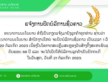 ແຈ້ງການ March 7, 2023 ແຈ້ງການປິດບໍລິການຊົ່ວຄາວ ໃນວັນທີ 08/03/2023 Posted By: admin 684 Views 0 Comment ສໍານັກງານໃຫຍ່ ທາງທະນາຄານນະໂຍບາຍຈະໄດ້ປິດໃຫ້ບໍລິການຊົ່ວຄາວໃນວັນທີ 08/03/2023 ເນື່ອງໃນໂອກາດສະເຫຼີມສະຫຼອງວັນແມ່ຍິງສາກົນຄົບຮອບ 113ປີ ແລະ ຈະເປີດໃຫ້ບໍລິການເປັນປົກກະຕິໃນວັນທີ 09/03/2023 ເປັນຕົ້ນໄປ