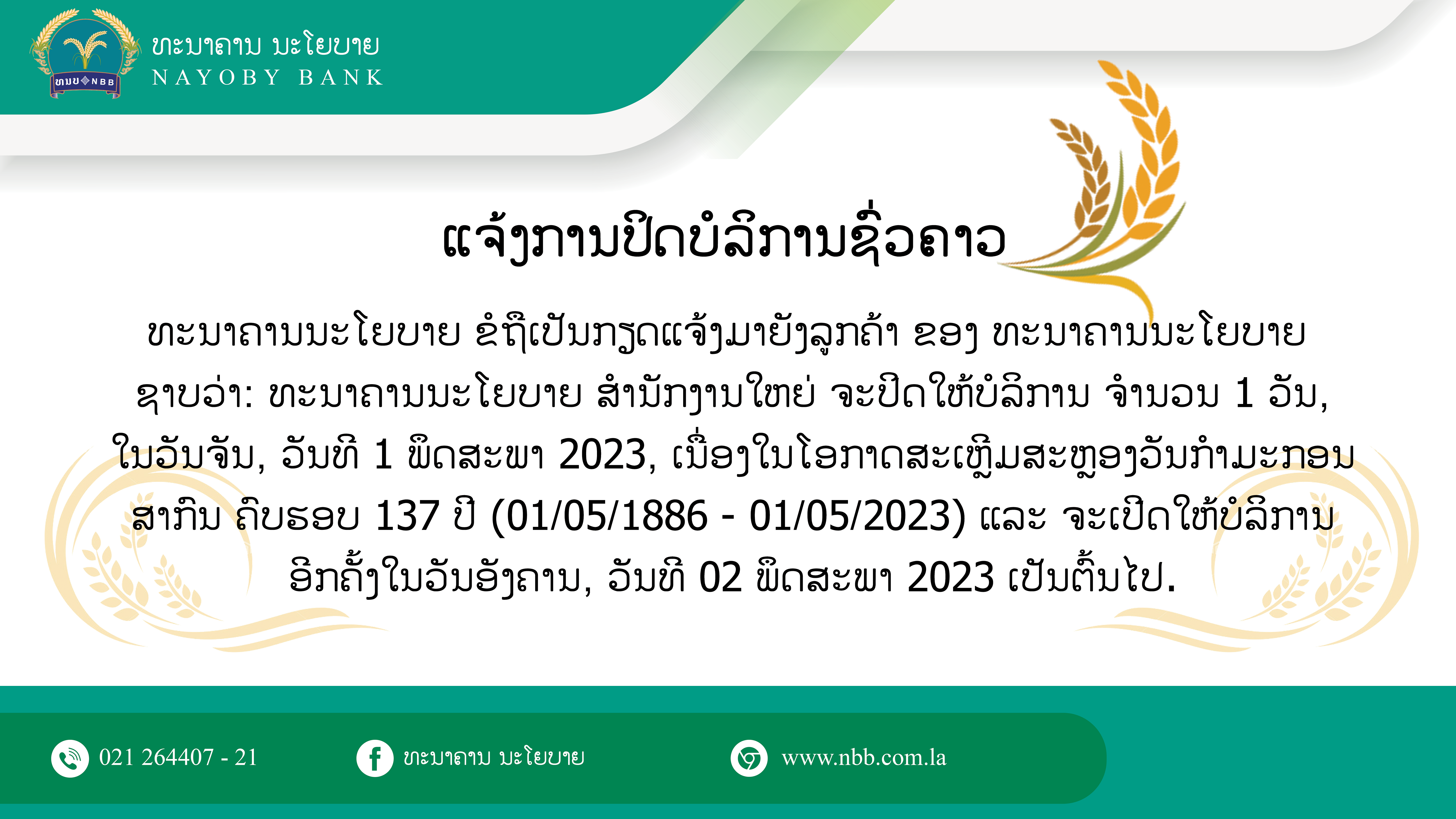 ທະນາຄານນະໂຍບາຍ ສໍານັກງານໃຫຍ່ ຈະໄດ້ປິດໃຫ້ບໍລິການຊົ່ວຄາວ ເປັນເວລາ 01 ວັນ ໃນວັນທີ 01/05/2023 ເນື່ອງໃນໂອກາດສະເຫຼີມສະຫຼອງວັນກໍາມະກອນສາກົນ ຄົບຮອບ 137ປີ (01/05/1886 – 01/05/2023) ແລະ ຈະເປີດໃຫ້ບໍລິການປົກກະຕິ ໃນວັນທີ 02/05/2023 ເປັນຕົ້ນໄປ
