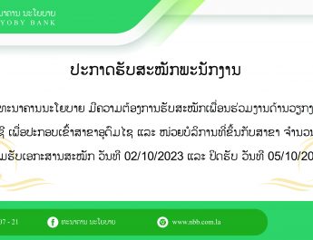 ທະນາຄານນະໂຍບາຍມີຄວາມຕ້ອງການຮັບສະໝັກເພື່ອນຮ່ວມງານ ດ້ານວຽກງານສິນເຊື່ອ ແລະ ບັນຊີເພື່ອປະກອບເຂົ້າສາຂາຜົ້ງສາລີ, ສາຂາອັດຕະປື ແລະ ໜ່ວຍບໍລິການທີ່ຂຶ້ນກັບສາຂາ ຈໍານວນ 09 ຄົນ. ເລີ່ມຮັບເອກະສານສະໝັກແຕ່ວັນທີ 18/09/2023 ແລະ ປິດຮັບວັນທີ 21/09/2023. ສາມາດດາວໂຫຼດຟອມສະໝັກໄດ້ບ່ອນນີ້